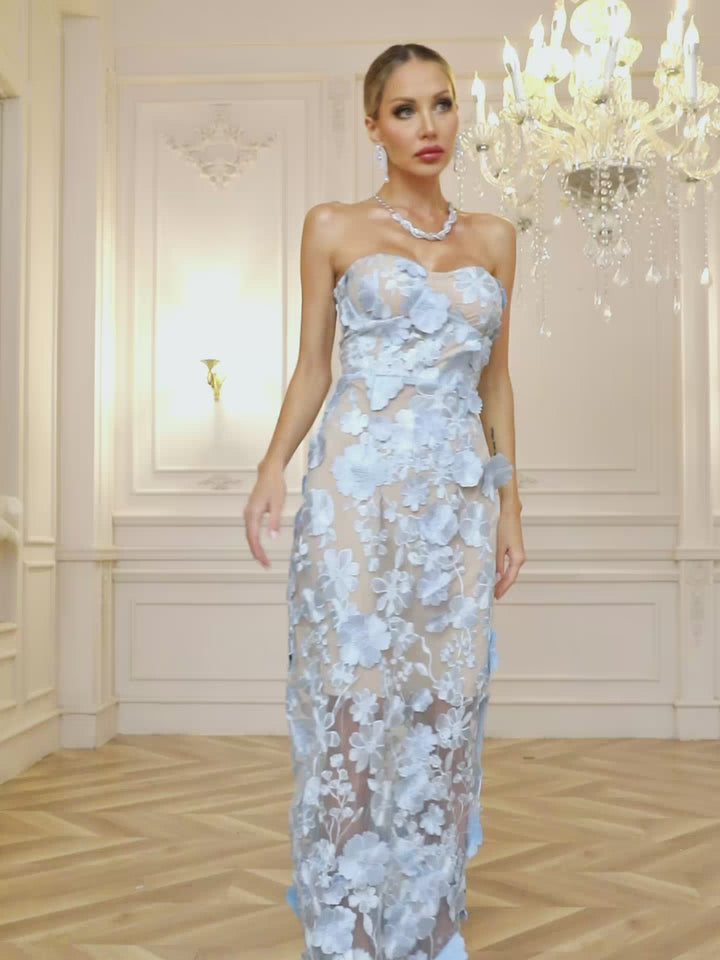 Step into effortless elegance with the Avital Strapless Flower Maxi Dress in Sky. This flowing maxi dress features a strapless design that beautifully highlights your shoulders and neckline, while the delicate floral pattern adds a touch of feminine charm. Its sky-blue color evokes a serene, airy vibe perfect for warm days and special occasions. Designed for comfort and style, the Avital dress moves gracefully with you, ensuring you stand out with every step. Elevate your wardrobe with a piece that combines timeless beauty and modern sophistication.
