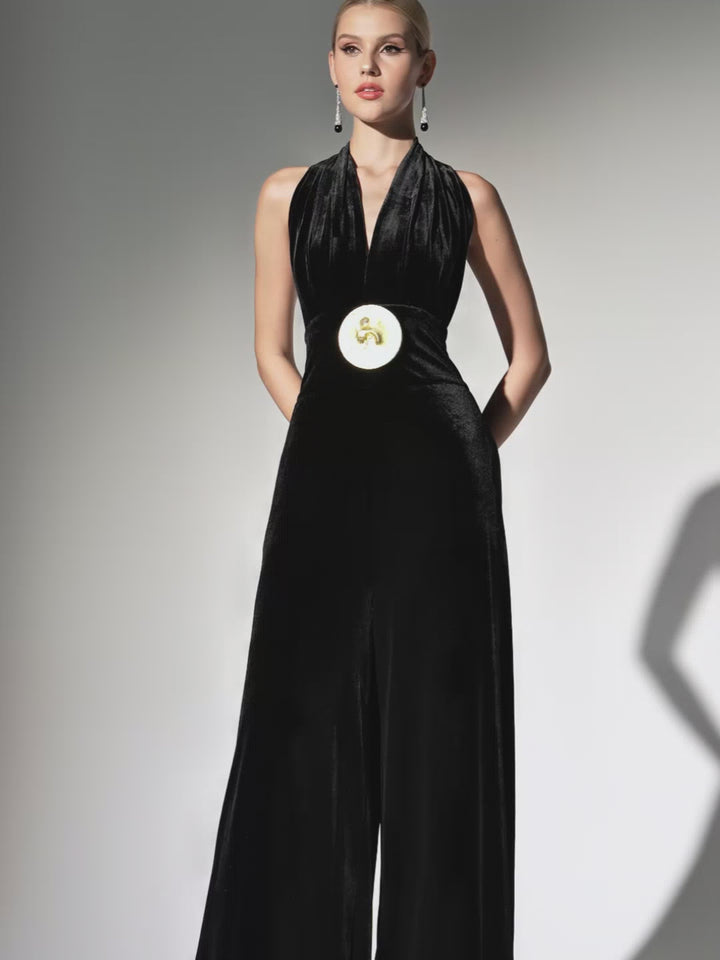 Make a striking entrance with the Brytni Halterneck Velvet Jumpsuit. Its luxurious velvet fabric and flattering halterneck design combine to create a sophisticated, modern look. The sleek silhouette enhances your figure while offering all-day comfort, making it an ideal choice for evening events or upscale gatherings.