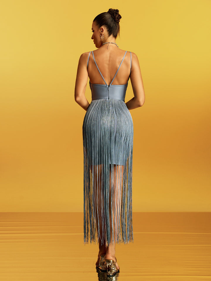 Fulguria Spaghetti Fringe Bandage Midi Dress