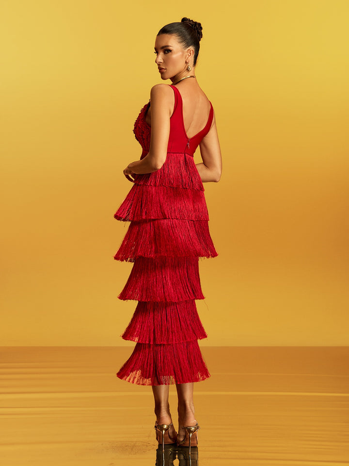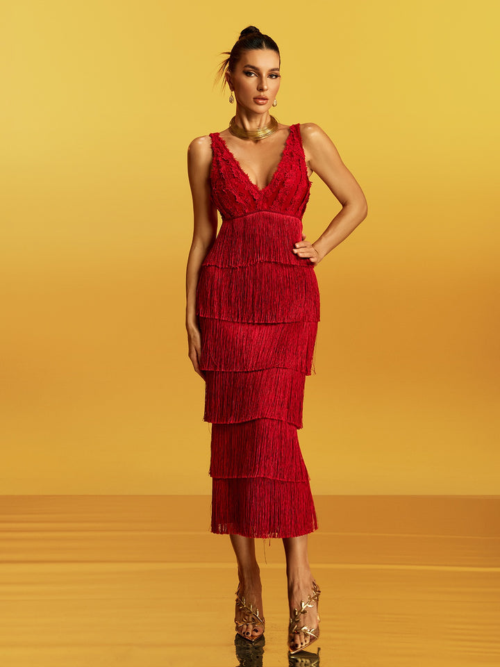 Galeon Sleeveless Lace Fringe Bandage Midi Dress