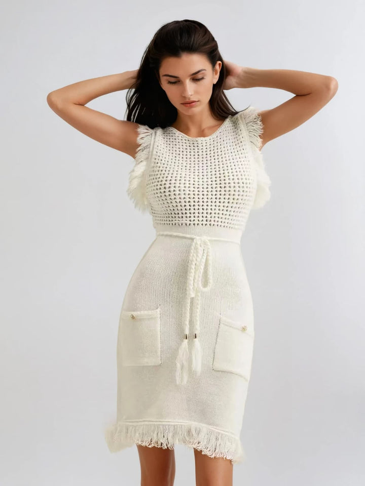 Elevate your evening look with the Gaussia Cutout Fringe Knitted Mini Dress—a statement piece that combines contemporary edge with timeless sophistication. Featuring strategic cutout details and playful fringe accents, this knitted mini delivers texture and visual interest that commands attention. The fitted silhouette flatters your figure while the luxurious knit fabric ensures all-day comfort. Perfect for nights out, parties, or whenever you want to make an unforgettable impression. Versatile enough to dress up with heels or down with sneakers, this dress is your go-to for turning heads.