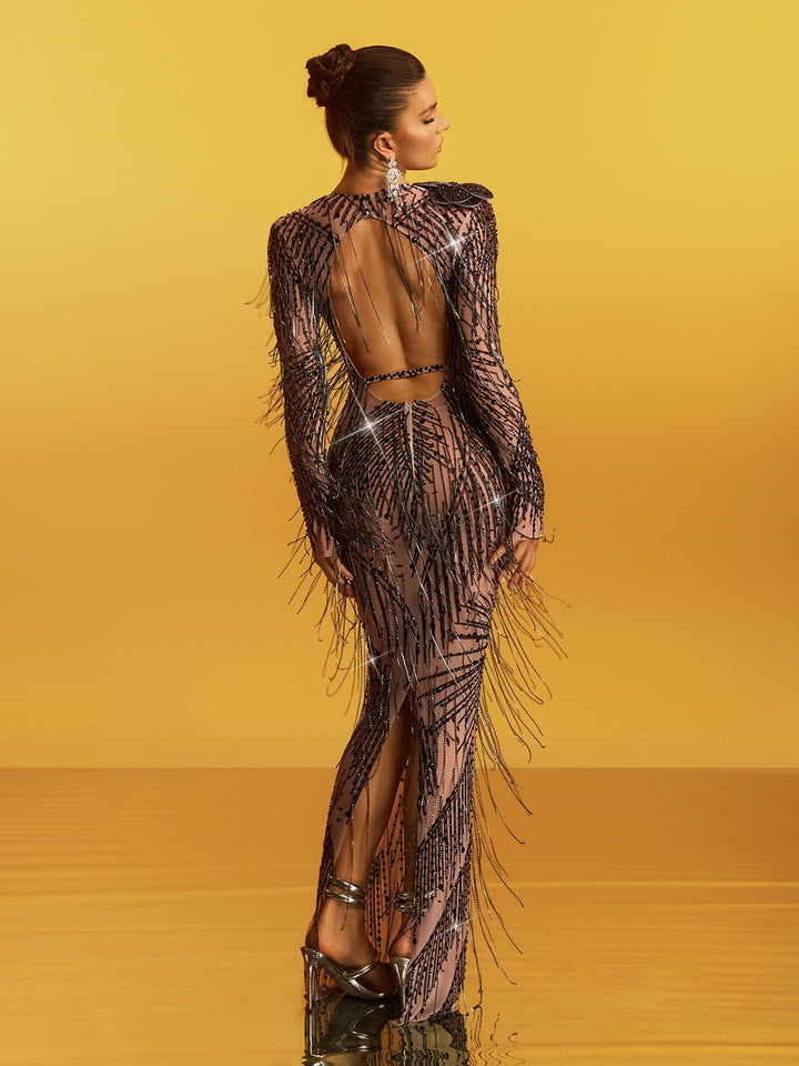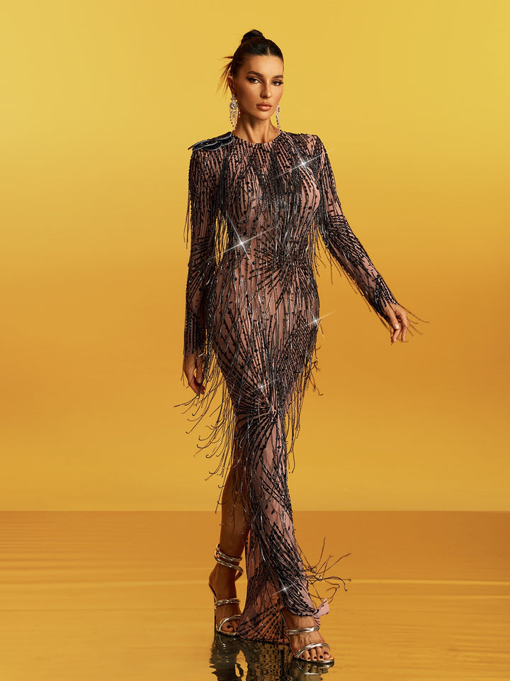 Elevate your evening look with the Geyera Cutout Fringe Diamond Split Maxi Dress—a show-stopping piece that commands attention. Featuring strategic cutouts and playful fringe detailing, this dress combines modern edge with timeless elegance. The diamond pattern adds visual intrigue while the dramatic side split offers movement and sophistication. Perfect for cocktail events, galas, or any occasion where you want to make a memorable impression. Crafted for the confident woman who refuses to blend in.