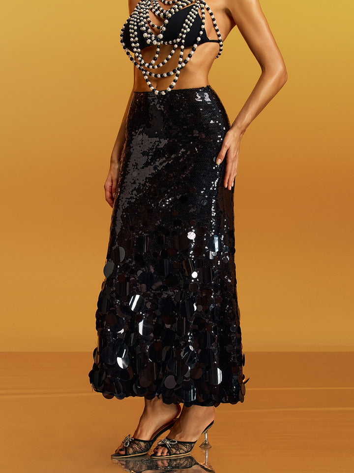 Elevate your evening look with the Glomara Round Sequin Skirt in Black. This show-stopping piece features shimmering sequins that catch the light with every movement, creating an eye-catching shimmer perfect for parties, celebrations, and special occasions. The flattering round silhouette offers comfortable wear while the luxurious black sequin detailing adds instant glamour to any outfit. Pair it with a simple top to let the skirt steal the spotlight, or dress it down for a more casual vibe. Transform your wardrobe with this versatile statement piece that guarantees heads will turn.