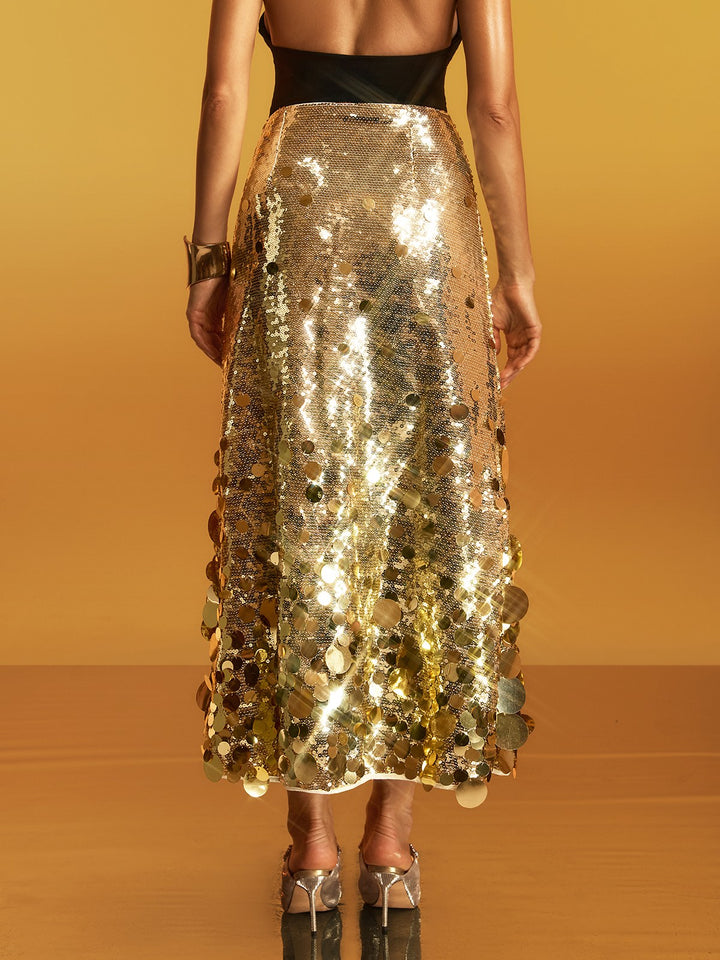 Elevate your evening look with the Glomara Round Sequin Skirt in Gold. This show-stopping piece features shimmering sequins that catch the light with every movement, creating an eye-catching shimmer perfect for parties, celebrations, and special occasions. The flattering round silhouette offers comfortable wear while the luxurious gold sequin detailing adds instant glamour to any outfit. Pair it with a simple top to let the skirt steal the spotlight, or dress it down for a more casual vibe. Transform your wardrobe with this versatile statement piece that guarantees heads will turn.