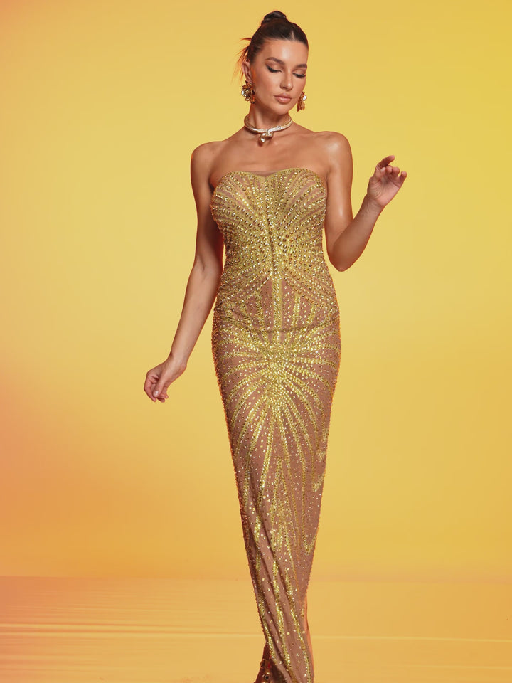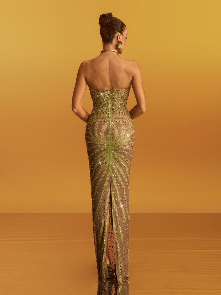 Elevate your evening elegance with the Gneissa Strapless Diamond Split Maxi Dress. This stunning piece features a sophisticated strapless neckline and eye-catching diamond cutout detailing that adds modern flair to a timeless silhouette. The dramatic side split creates movement and allure with every step, making it perfect for galas, weddings, or upscale events. Crafted for those who refuse to compromise on style, this maxi dress combines refined femininity with bold design elements. Turn heads and command attention in a gown that transforms any occasion into an unforgettable moment.