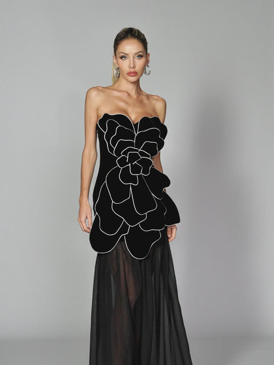 Embrace romantic elegance with the Luffy Strapless Flower Mesh Maxi Dress. Featuring delicate floral mesh and a graceful strapless design, this maxi dress flows beautifully to create a captivating silhouette. Perfect for special occasions or evening events, it effortlessly combines femininity and sophistication for a look that truly stands out.