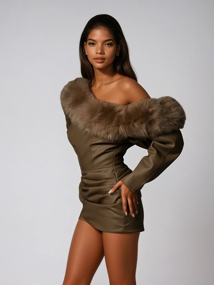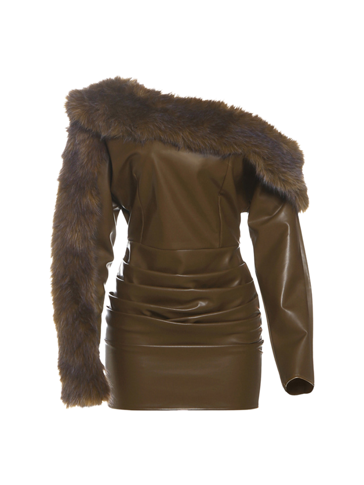 Dioptra One Shoulder Leather Faux Fur Mini Dress