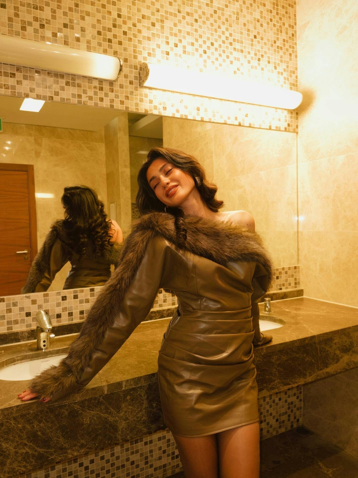 Dioptra One Shoulder Leather Faux Fur Mini Dress In Chocolate