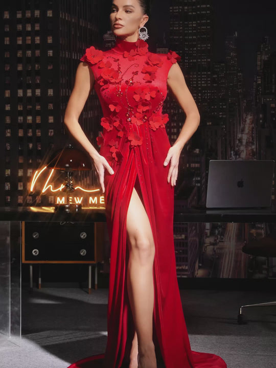 Mavira Flower Crystal Split Velvet Maxi Dress