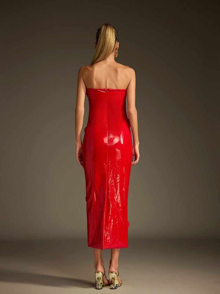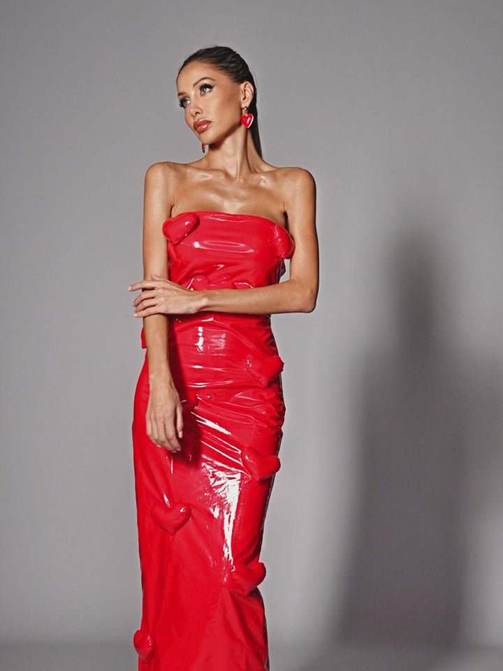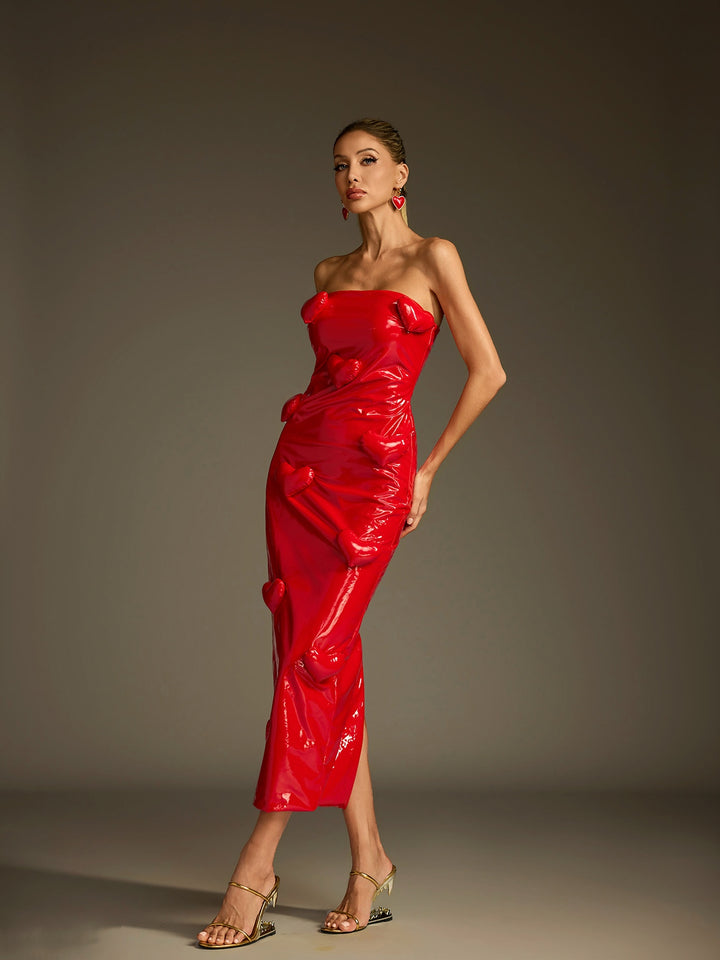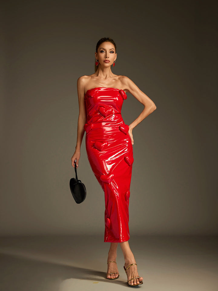 Make a bold statement in the Taron Strapless Heart Leather Midi Dress. Crafted from sleek leather, its strapless design and heart-shaped neckline combine edgy allure with feminine charm. The midi length offers a sophisticated silhouette that’s perfect for turning heads at any event, blending confidence and style in one unforgettable piece.