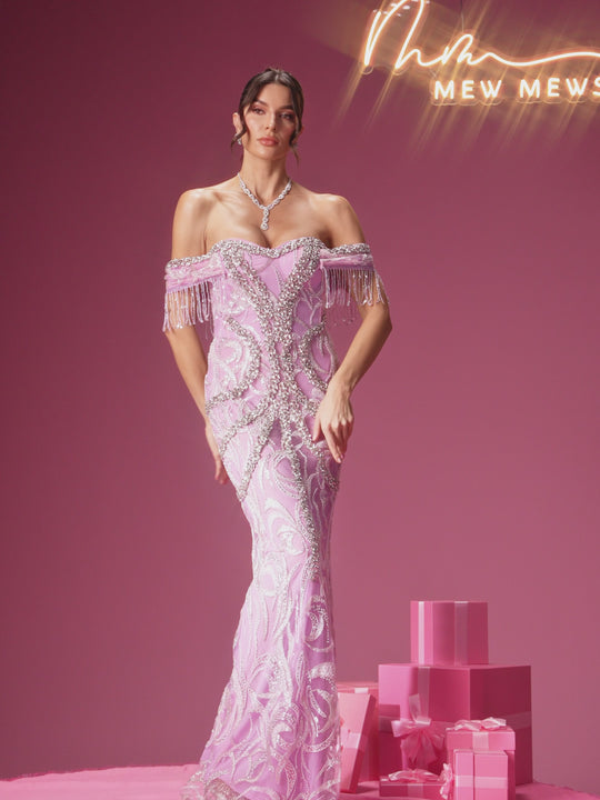 Mylonitor Off Shoulder Fringe Crystal Maxi Dress