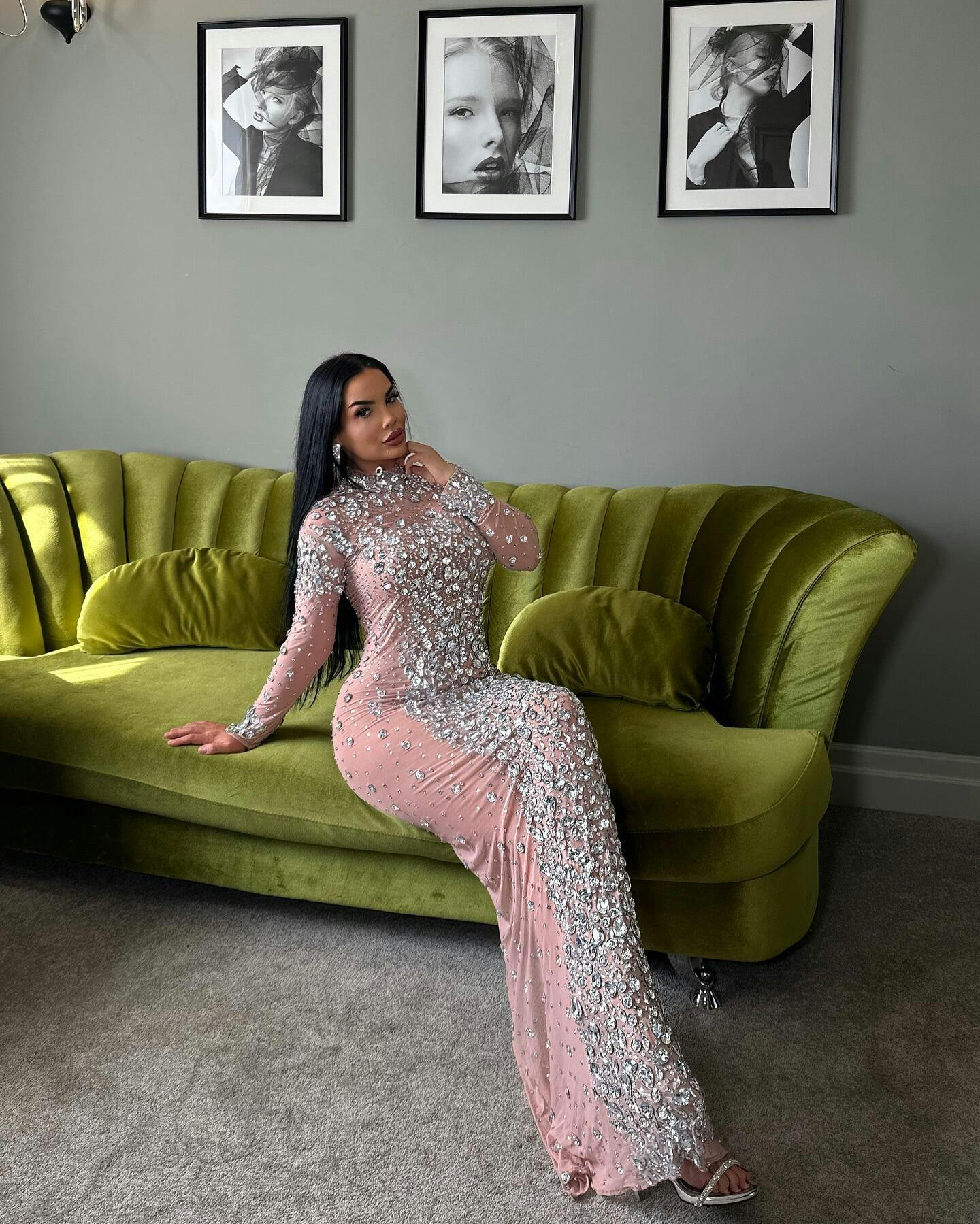 Robe longue fendue à strass et manches longues Eadwiella