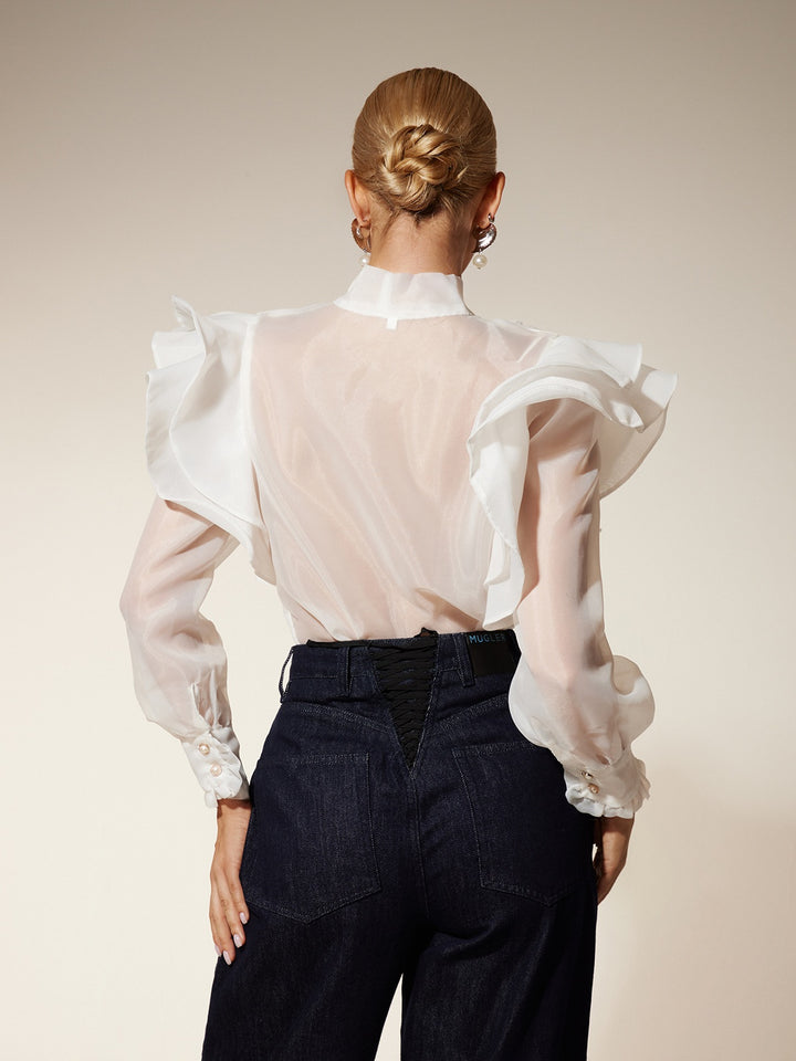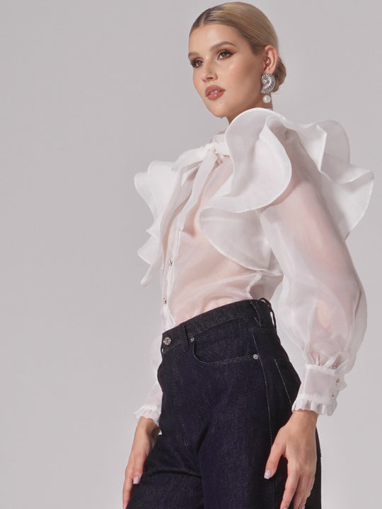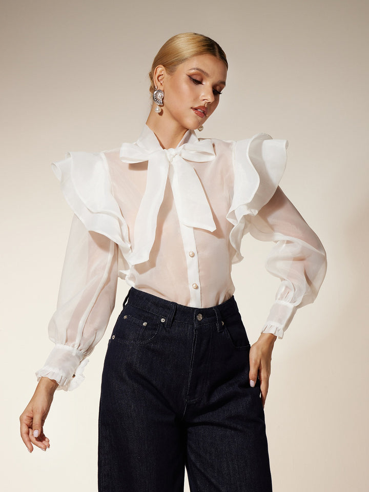 Embrace feminine charm with the Eiko Bow Ruffle Shirt, a delightful piece that celebrates playful elegance. Charming ruffles and a signature bow detail create visual interest and personality, transforming an everyday shirt into a statement piece. Perfect for adding dimension to your wardrobe, this shirt works beautifully dressed up or down, making it ideal for any occasion. Whether you're seeking to refresh your style or express your individuality, the Eiko delivers the perfect blend of sweetness and sophistication that sets you apart.