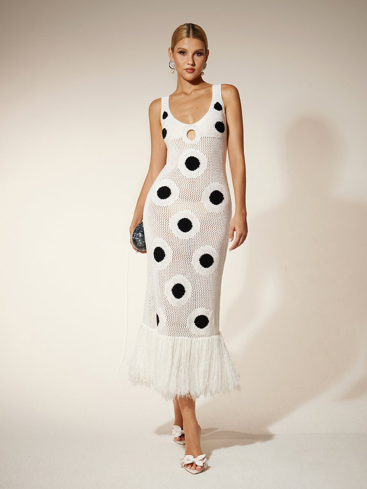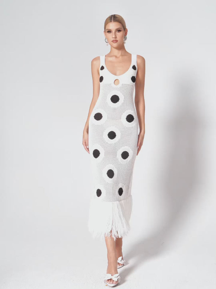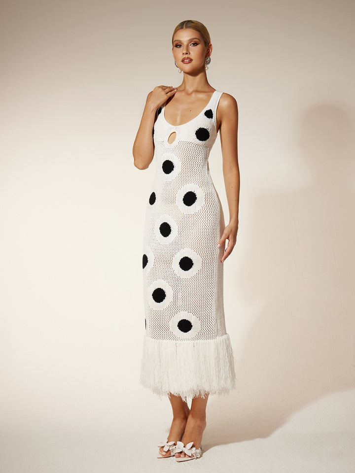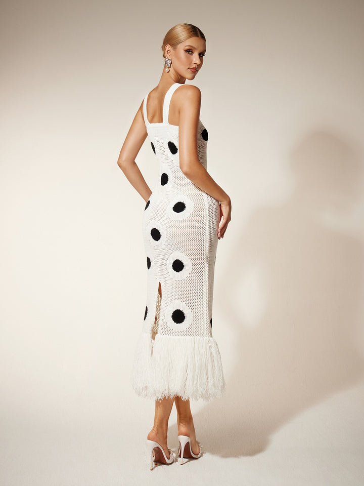 Gaelion Dot Fringe Knitted Midi Dress In White