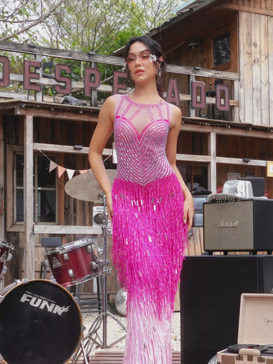Saelyvira Fringe Rhinestone Maxi Dress In Pink