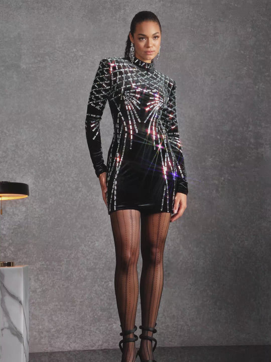 Behnam Long Sleeve Rhinestone Velvet Dress