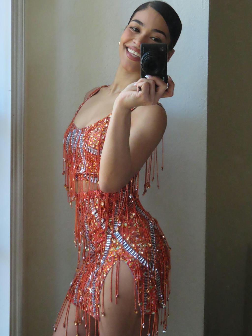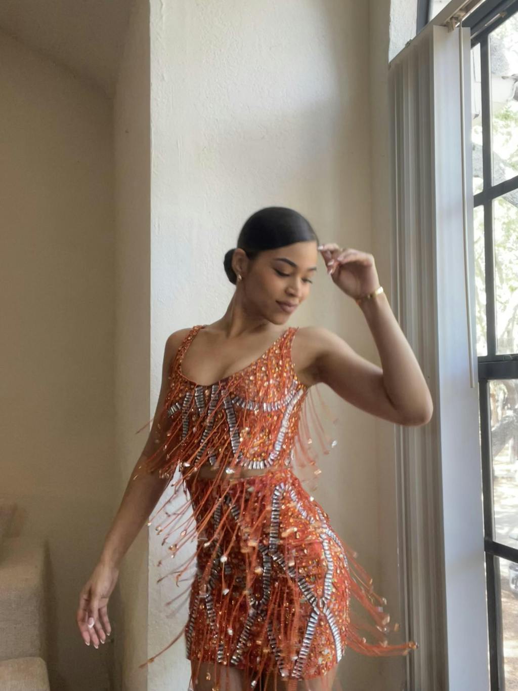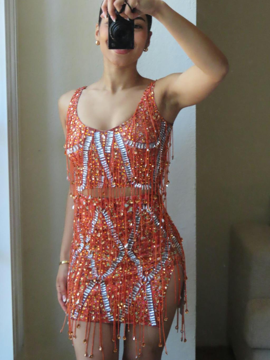 Colette Crystal Chain Fringe Split Skirt Set In Orange