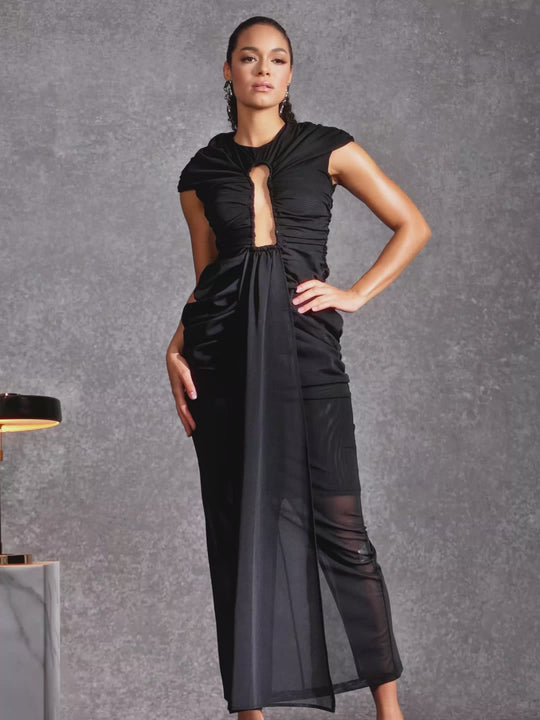 Drosyne Cutout Ruched Draped Maxi Dress In Black