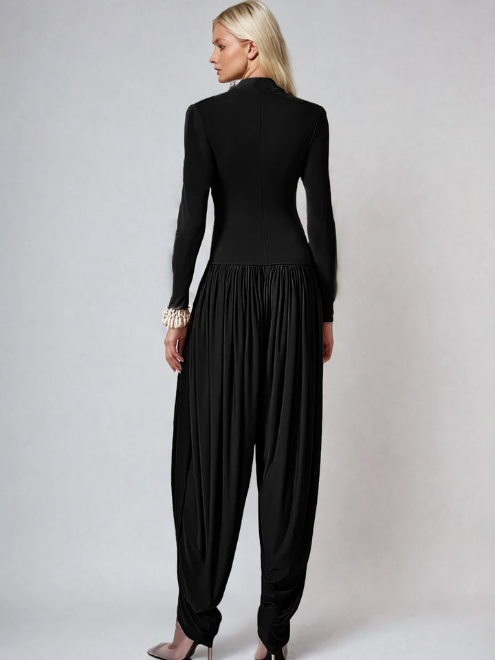 Discover bold sophistication with the Laurien Long Sleeve Ruched Jumpsuit. Its flattering ruched detailing enhances your silhouette, while the long sleeves add a touch of elegance and coverage. Designed for both comfort and style, this jumpsuit is perfect for making a confident statement at any event or night out. Step into versatile glamour that effortlessly elevates your look.