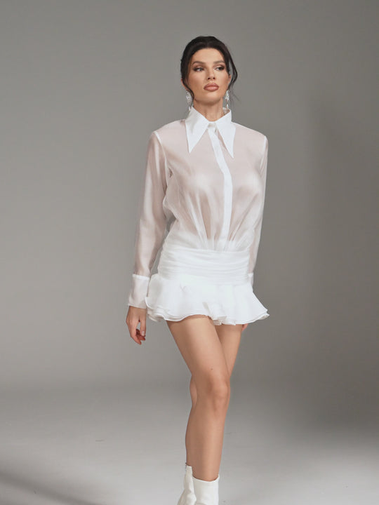 The Lizeth Collar Ruffle Ruched Mini Dress features charming ruffle details and flattering ruching that enhance your silhouette with feminine elegance. The classic collar adds a polished touch, making this mini dress perfect for both casual outings and dressier occasions. Embrace a playful yet sophisticated look that turns heads effortlessly.