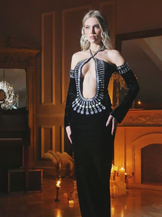 Elevate your evening wardrobe with the Osgood Cutout Crystal Velvet Maxi Dress. Crafted from sumptuous velvet, this dress offers a glamorous silhouette that hugs your figure while the strategic cutouts add a daring edge. Sparkling crystal accents bring a touch of luxury, perfect for making a memorable statement at any event. Experience the perfect blend of elegance and bold style that ensures you stand out with confidence.