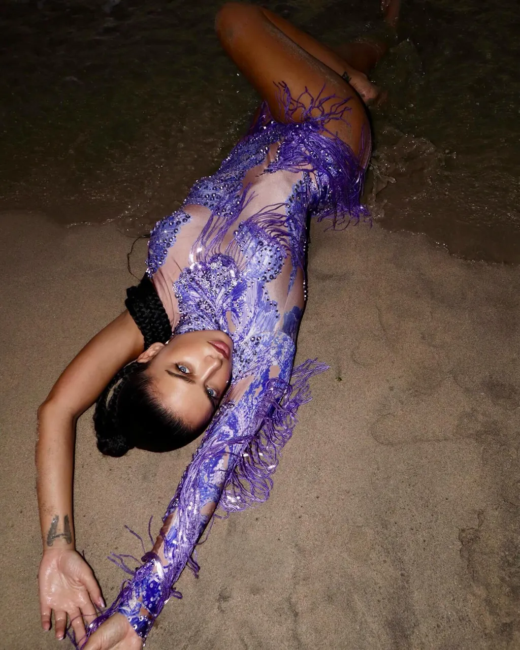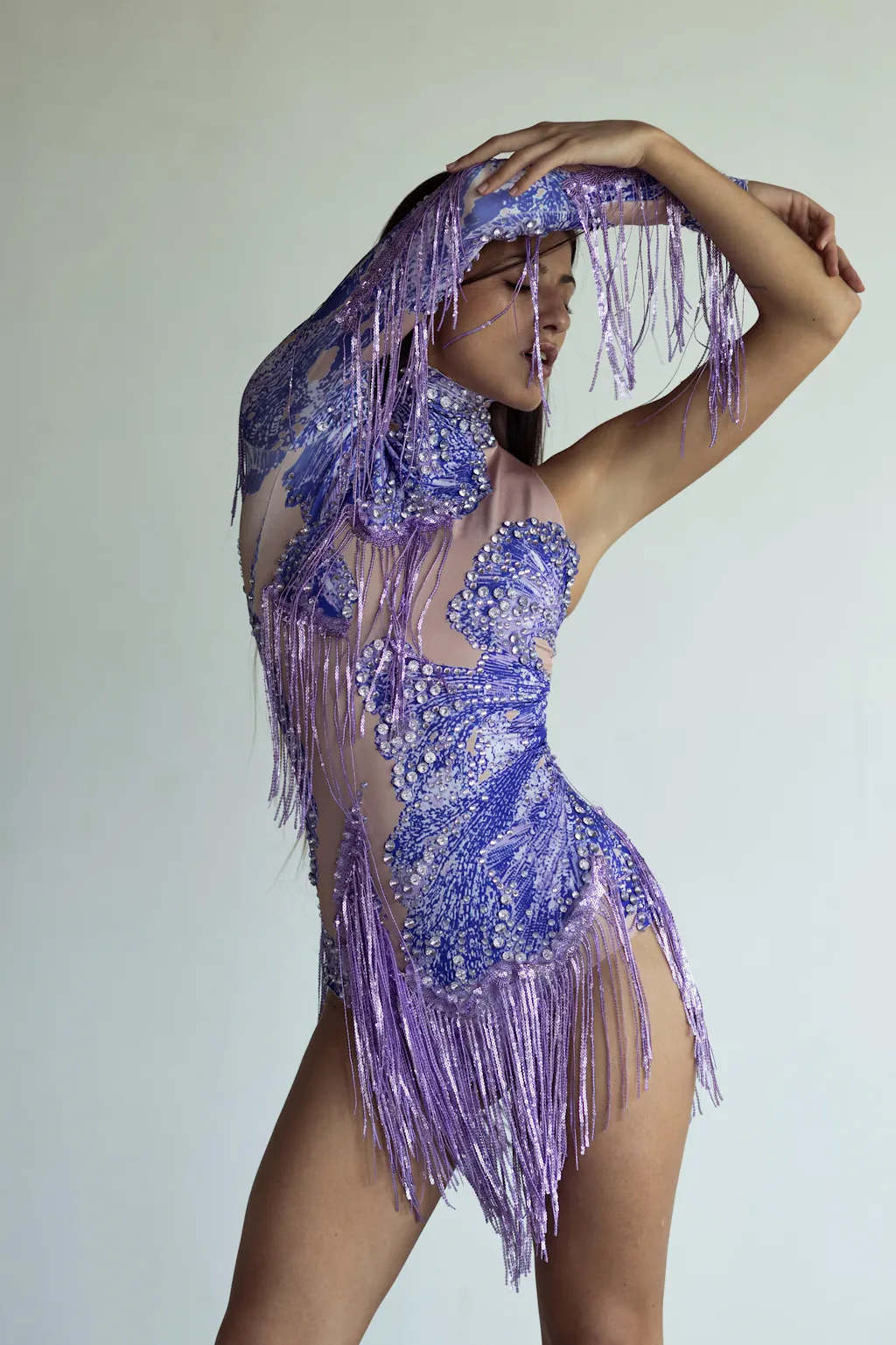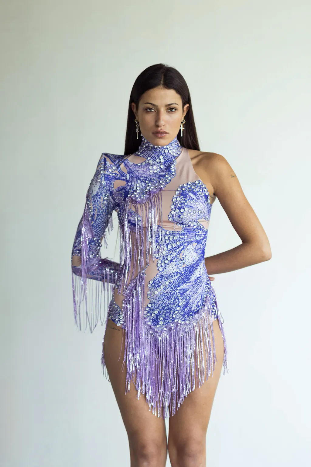 Shatora One Shoulder Rhinestone Fringe Bodysuit In Purple