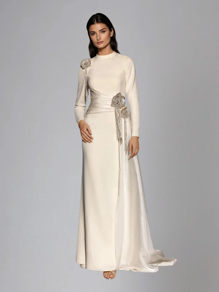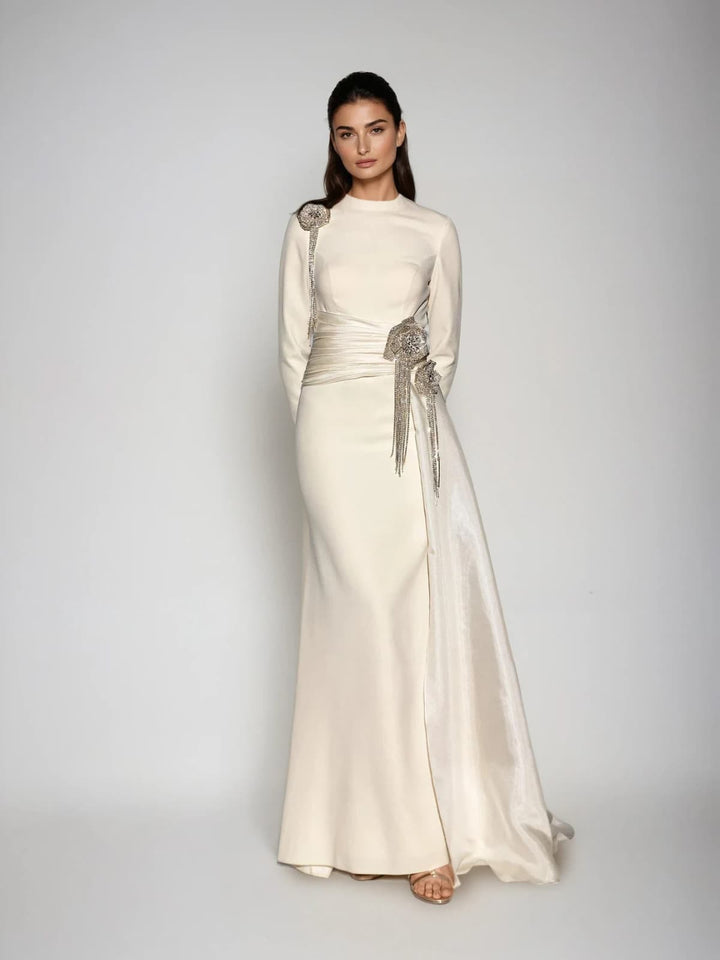 Karmanor Long Sleeve Draped Flower Maxi Dress