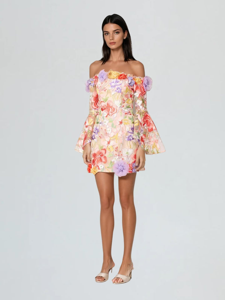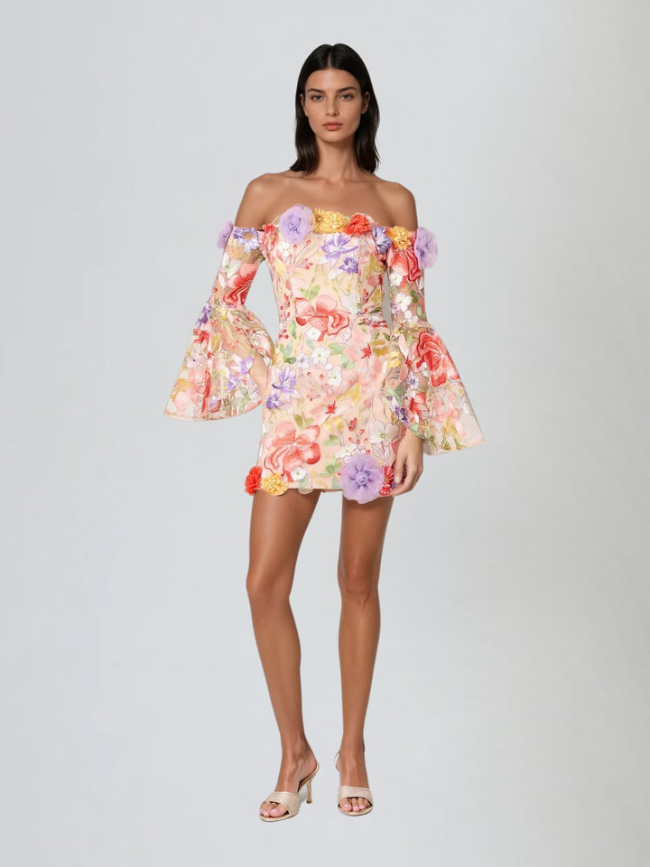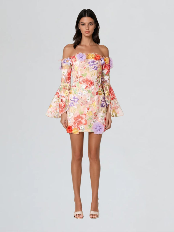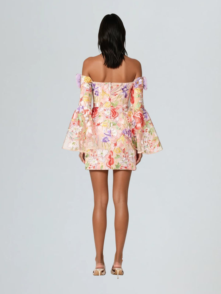 Deltria Off Shoulder Flower Embroidered Mini Dress