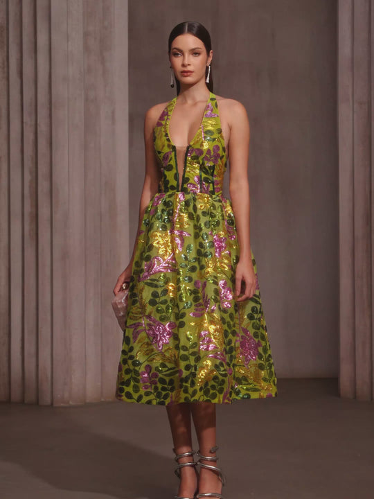 Javixor Plunge Neck Floral Sequin Midi Dress