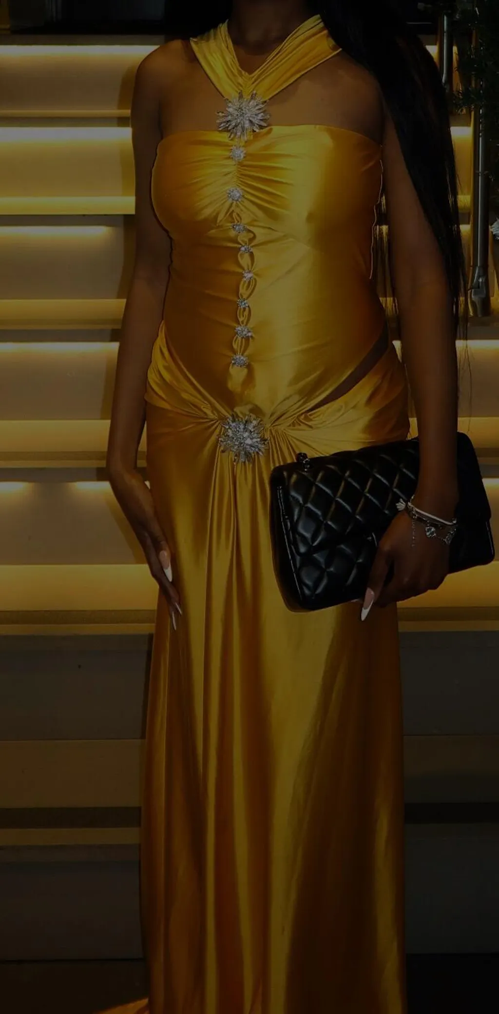 Indulge in luxury with the Panya Crystal Cutout Satin Maxi Dress. Made from high-quality satin, this dress boasts a stunning cutout design adorned with sparkling crystals. Its maxi length adds an air of sophistication while its lightweight fabric ensures comfort. Elevate your evening wear with this elegant and eye-catching piece.