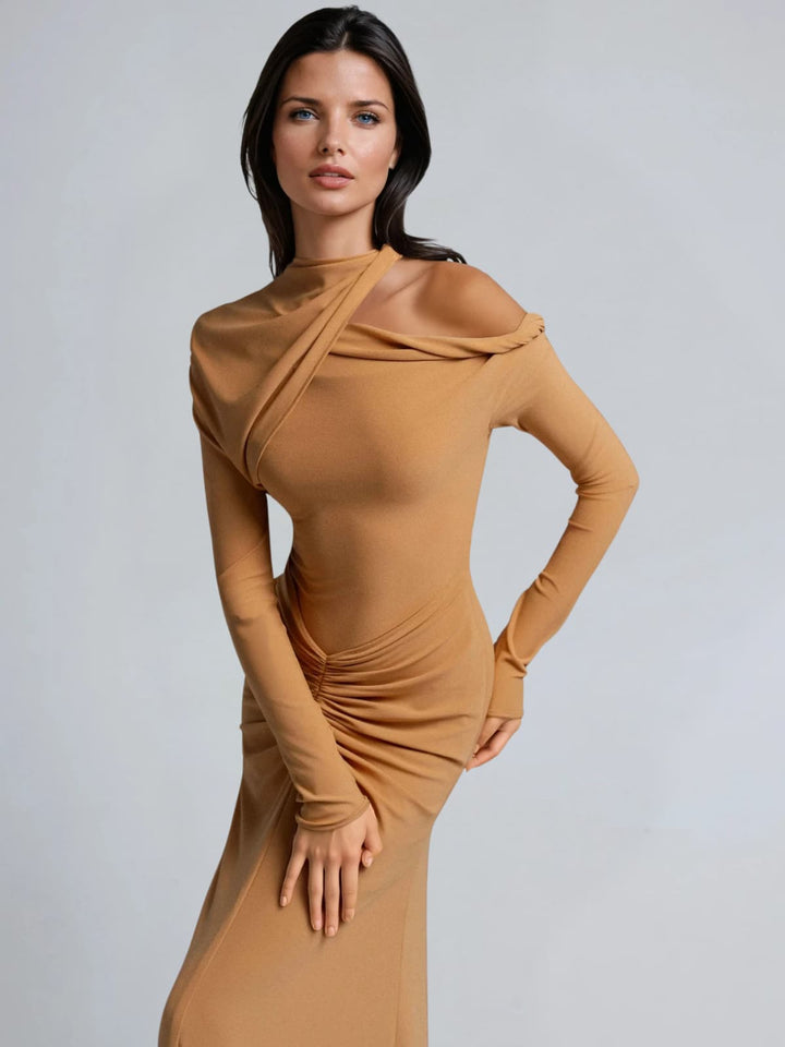 Embrace elegance with the Aelius One Shoulder Ruched Maxi Dress in Orange. Its graceful one-shoulder design and flattering ruching create a sophisticated silhouette that enhances your natural curves. The rich orange shade adds warmth and versatility, perfect for any occasion from evening events to stylish gatherings. Step into confidence and timeless style with this effortlessly chic maxi dress.