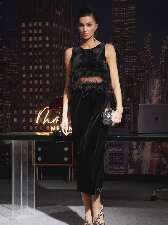 Anavia Sleeveless Feather Velvet Midi Dress