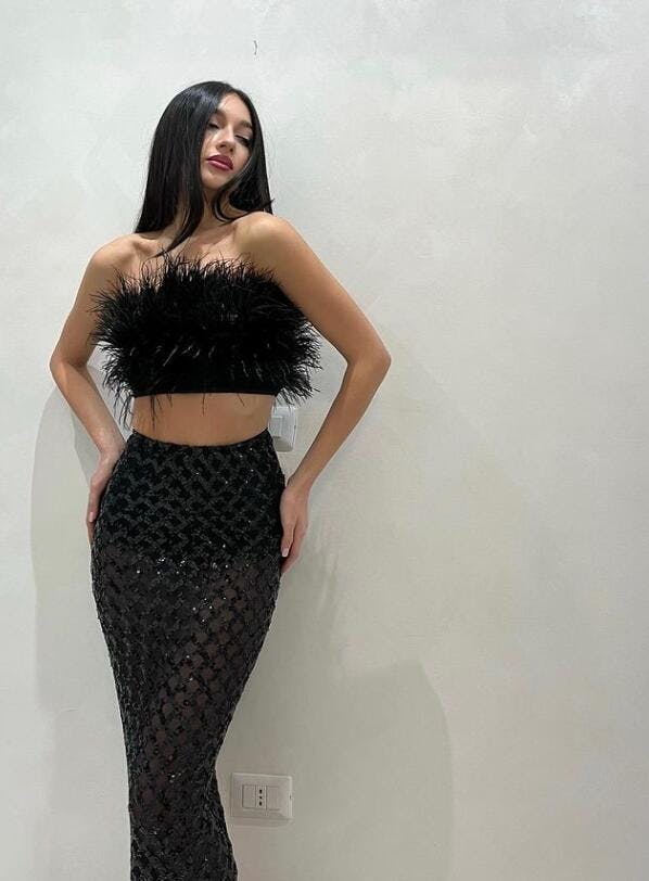The Ansley Strapless Feather Mesh Skirt Set In Black is the perfect statement piece for nights out! This adorable tube top features a faux feather details and a cropped silhouette. This skirt features a mesh fabric with full sequins. Wear it with sparkling earrings and heels for a dazzling look.