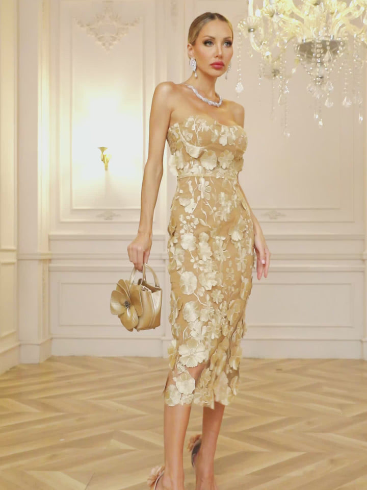 Add a touch of elegance and femininity to your wardrobe with the Avital Strapless Flower Midi Dress. This beautifully designed dress features a flattering strapless neckline and a stunning flower print that will turn heads. Perfect for any occasion, this dress is a must-have for any fashion-forward individual.