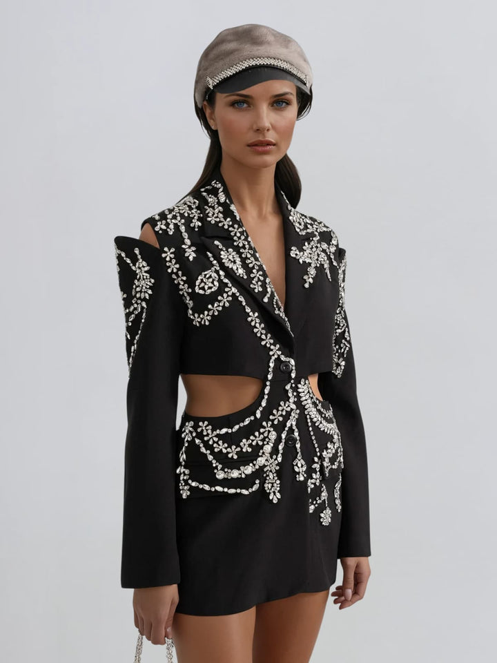 Elevate your wardrobe with the Caldera V Neck Crystal Cutout Blazer, designed to combine sleek sophistication with modern edge. Featuring a flattering V neckline and sparkling crystal cutout accents, this blazer adds a touch of glamour to any outfit. Perfect for making a confident statement at work or evening events, it offers a polished fit that enhances your silhouette while showcasing unique detailing for standout style. Make every occasion unforgettable with this striking blazer that blends timeless elegance with contemporary flair.