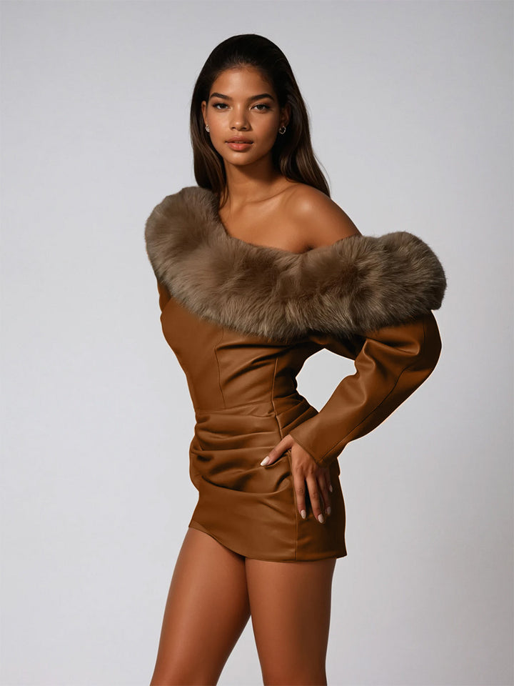 Dioptra One Shoulder Leather Faux Fur Mini Dress In Caramel