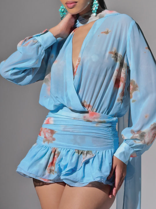 Doren Floral Ruched Scarf Mini Dress In Sky