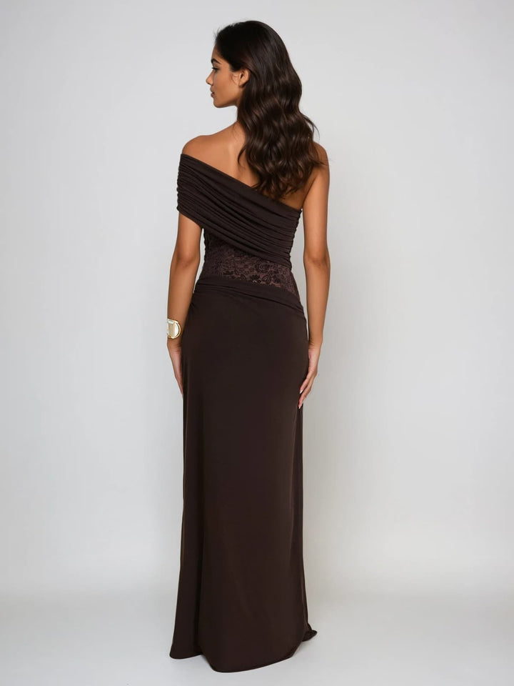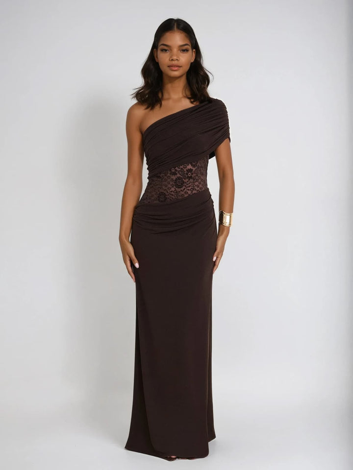 Encoda One Shoulder Ruched Lace Maxi Dress