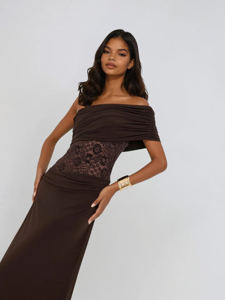 Elevate your evening elegance with the Encoda One Shoulder Ruched Lace Maxi Dress. This stunning piece features delicate lace detailing and strategic ruching that flatters your silhouette while the asymmetrical one-shoulder neckline adds modern sophistication. The flowing maxi length creates a graceful, elongated look perfect for formal events, galas, or upscale celebrations. Crafted for those who appreciate timeless style with contemporary flair, this dress transforms any occasion into a memorable moment. Make a lasting impression with refined glamour.