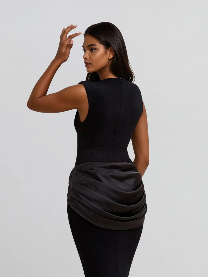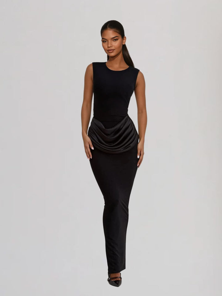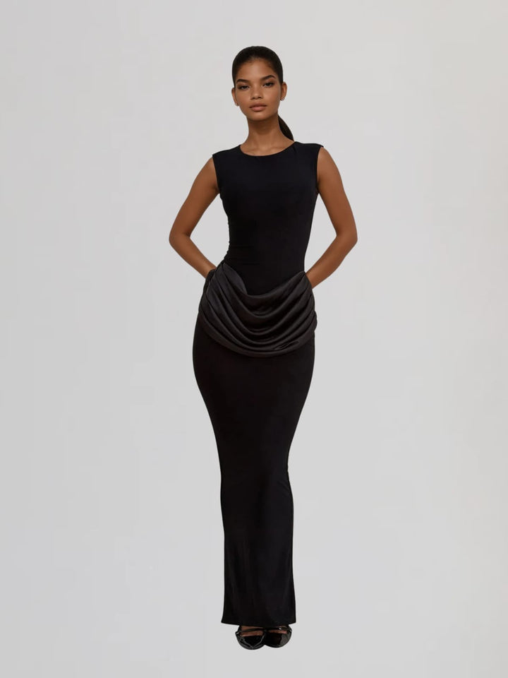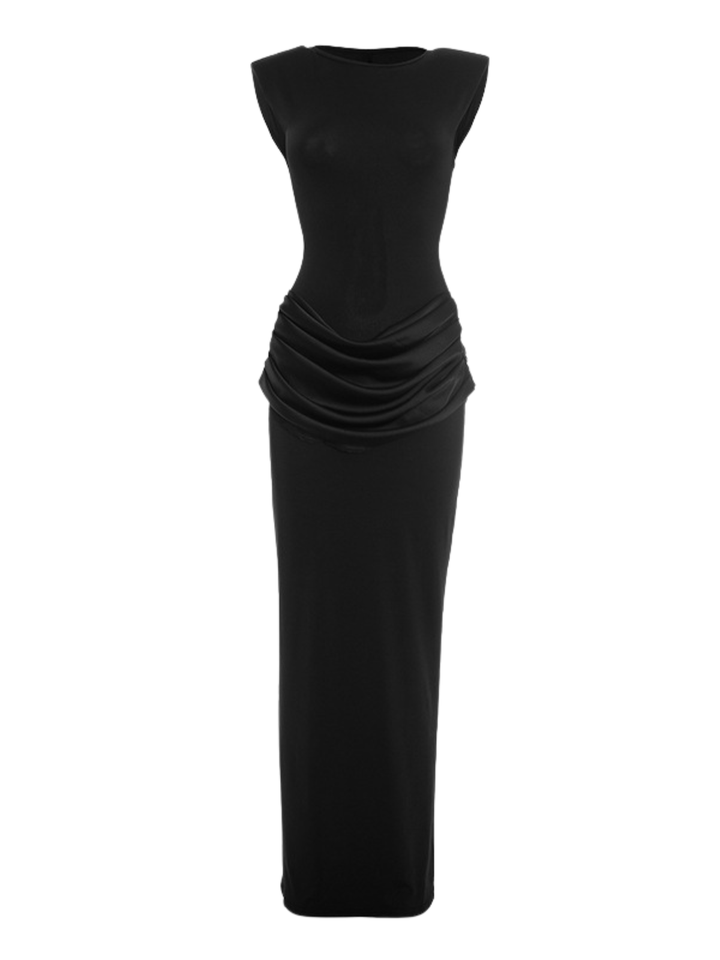 Elevate your evening wardrobe with the Fumidia Sleeveless Ruched Satin Maxi Dress in Black. This sophisticated piece features luxurious satin fabric with elegant ruching that flatters your silhouette while creating stunning visual dimension. The sleeveless design offers versatility for layering or showcasing statement jewelry, while the flowing maxi length delivers timeless elegance for any formal occasion. Perfect for galas, weddings, or upscale events, this dress combines refined craftsmanship with effortless grace. The soft Black tone complements all skin tones and pairs beautifully with metallic accessories or classic heels.