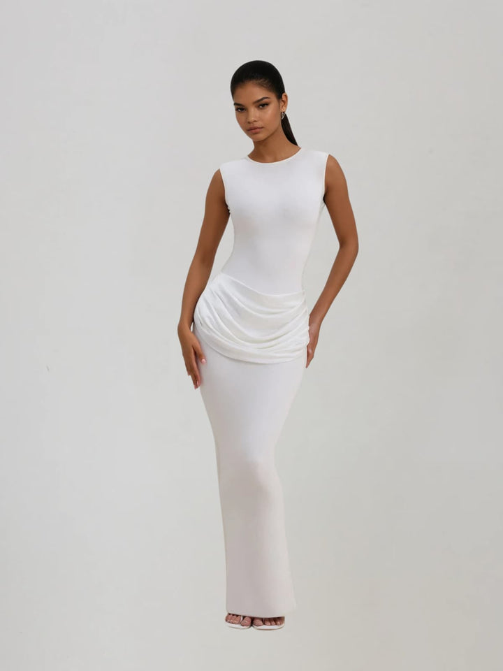 Elevate your evening wardrobe with the Fumidia Sleeveless Ruched Satin Maxi Dress in White. This sophisticated piece features luxurious satin fabric with elegant ruching that flatters your silhouette while creating stunning visual dimension. The sleeveless design offers versatility for layering or showcasing statement jewelry, while the flowing maxi length delivers timeless elegance for any formal occasion. Perfect for galas, weddings, or upscale events, this dress combines refined craftsmanship with effortless grace. The soft White tone complements all skin tones and pairs beautifully with metallic accessories or classic heels.