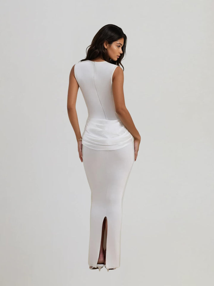 Fumidia Sleeveless Ruched Satin Maxi Dress In White