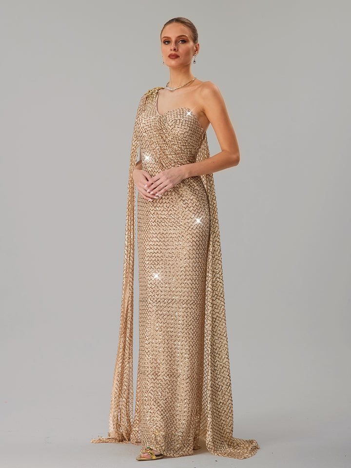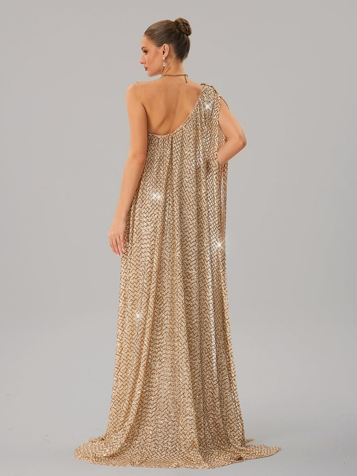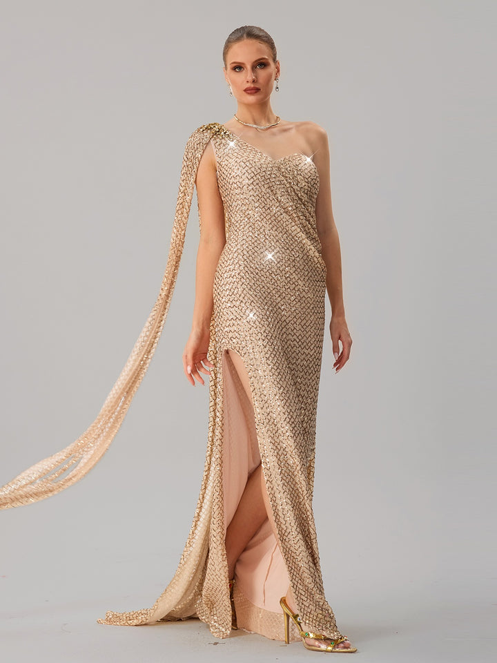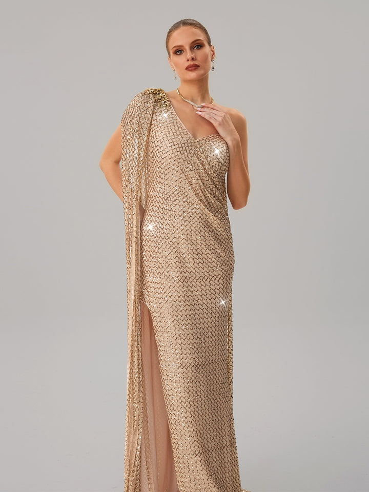 Junctionet One Shoulder Shawl Sequin Split Maxi Dress