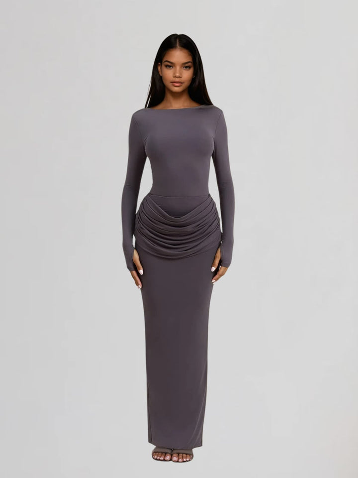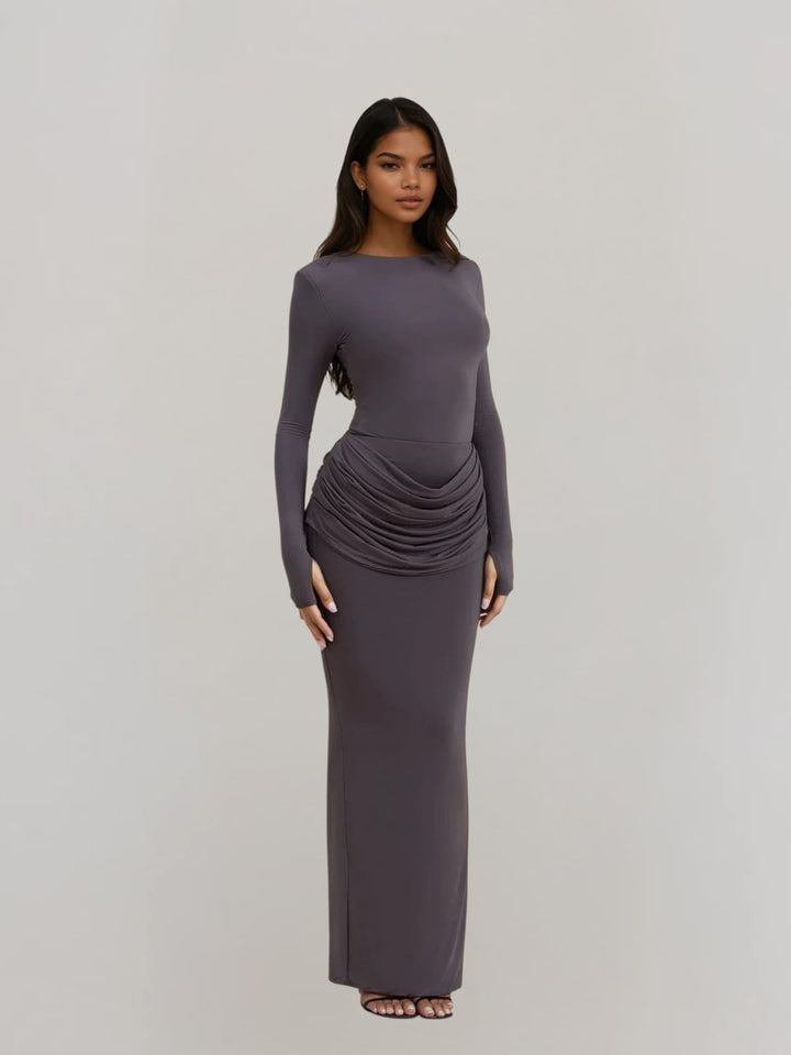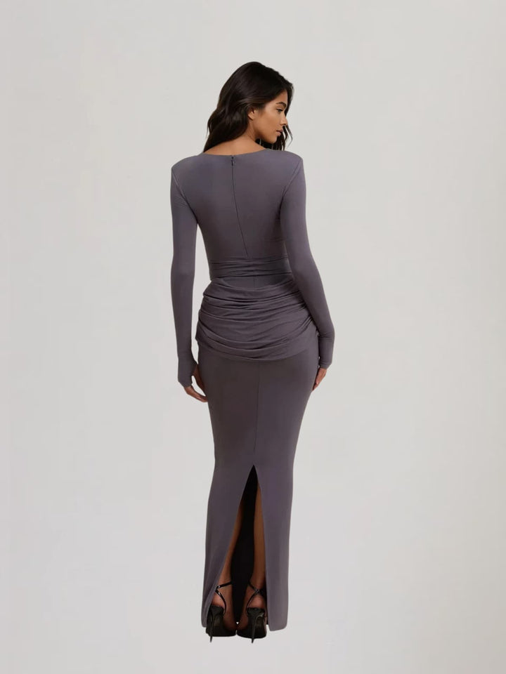 Jutflare Long Sleeve Ruched Split Maxi Dress In Grey
