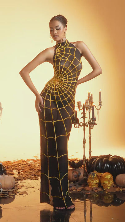 Make a bold statement in the Kaelyra High Neck Cobweb Rhinestone Maxi Dress in Gold. This dazzling gown features an intricate cobweb design adorned with shimmering rhinestones, creating a captivating sparkle from every angle. The high neckline adds a touch of sophistication, while the flowing maxi length ensures graceful elegance. Perfect for glamorous occasions where you want to stand out and exude confidence. Embrace luxury and let your style shine with this unforgettable dress.