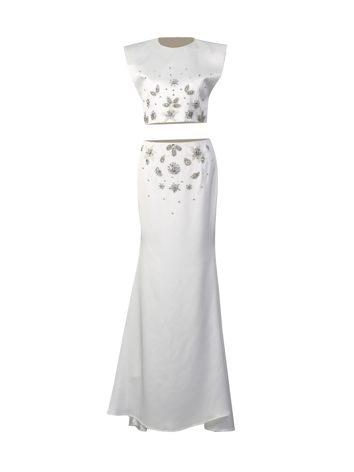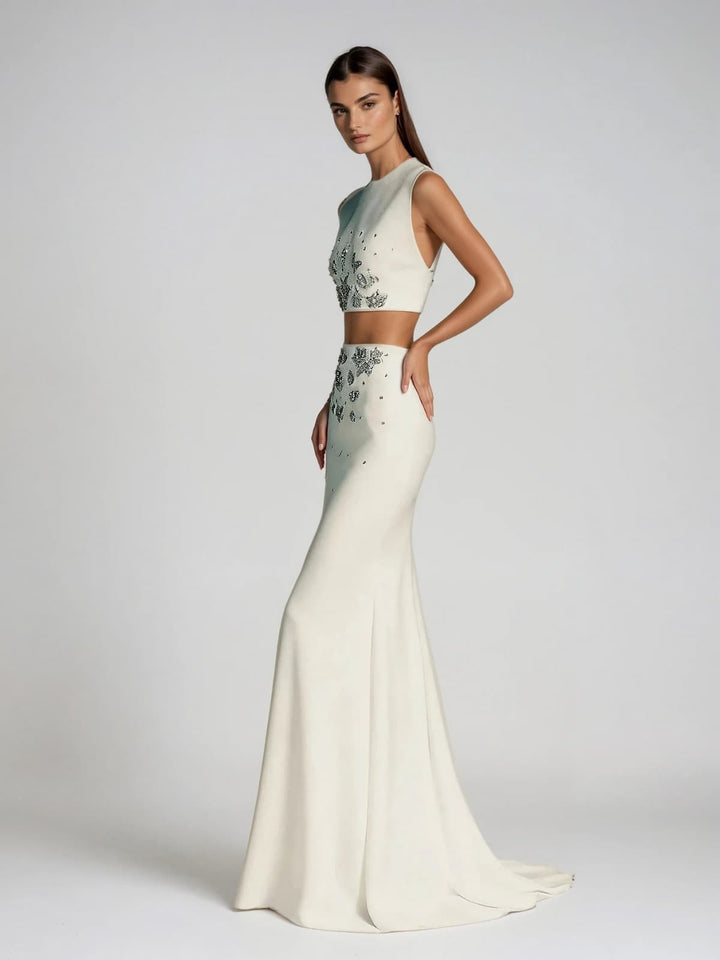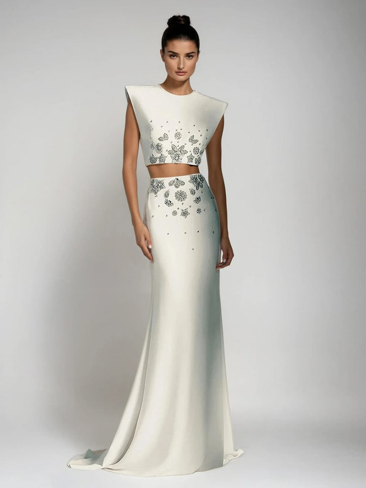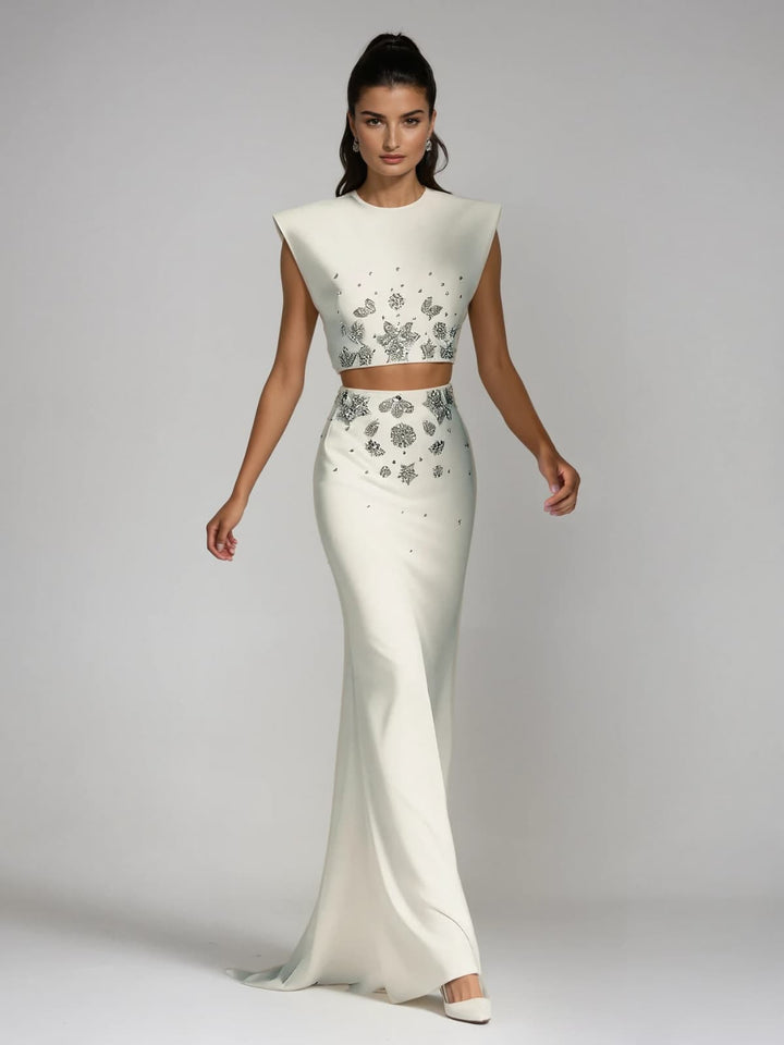 Elevate your wardrobe with the Kelvina Sleeveless Crystal Skirt Set, where timeless elegance meets modern sophistication. This stunning two-piece ensemble features a sleek sleeveless top paired with a gracefully flowing skirt adorned with shimmering crystal embellishments that catch the light beautifully. Perfect for special occasions, evening events, or when you want to make a memorable impression, this set combines refined style with comfortable wear. The crystal detailing adds a touch of glamour without overwhelming your silhouette, while the coordinated pieces ensure a polished, put-together look every time. Ideal for those who appreciate quality craftsmanship and distinctive design.