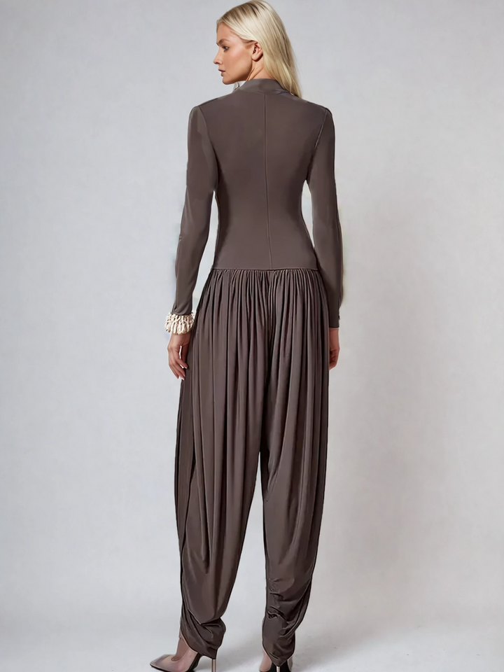 Discover bold sophistication with the Laurien Long Sleeve Ruched Jumpsuit. Its flattering ruched detailing enhances your silhouette, while the long sleeves add a touch of elegance and coverage. Designed for both comfort and style, this jumpsuit is perfect for making a confident statement at any event or night out. Step into versatile glamour that effortlessly elevates your look.