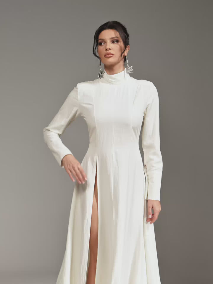 The Litany High Neck Split Maxi Dress offers a sophisticated silhouette with its elegant high neckline and daring side split. Designed to enhance your confidence and style, this maxi dress is perfect for formal events or evening outings. Its flowing fabric and flattering cut create a striking look that moves with grace, making it an essential addition to your wardrobe.