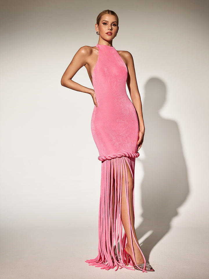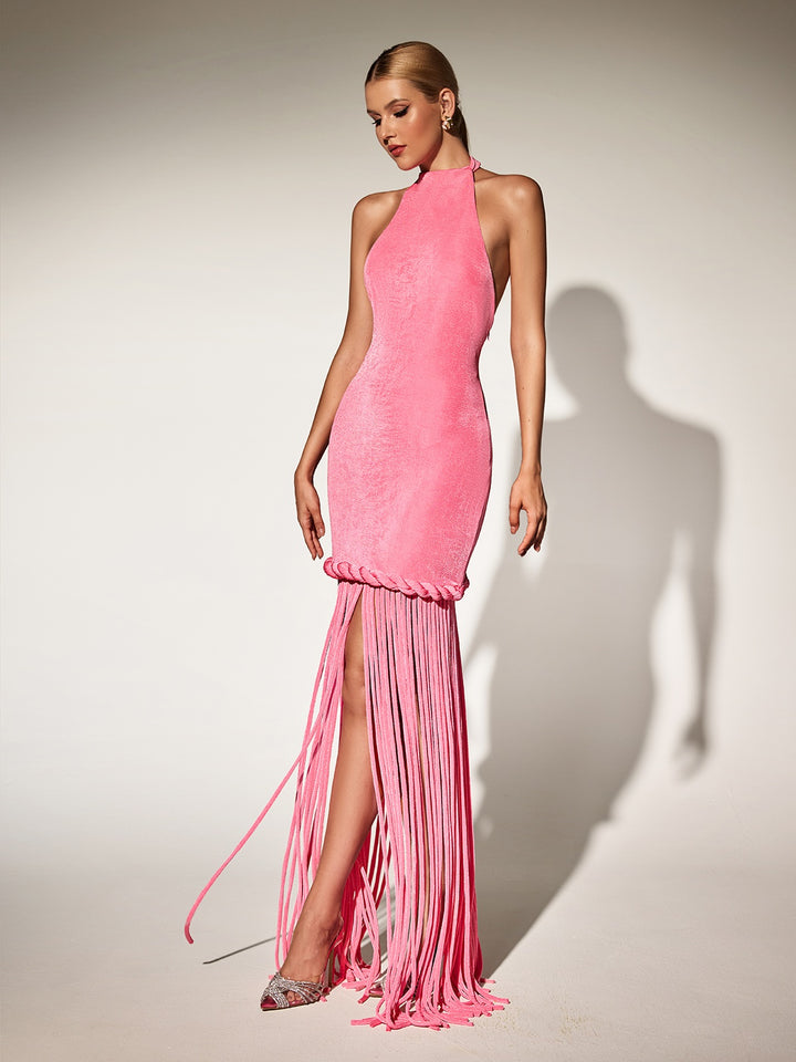Litonya Halterneck Fringe Velvet Maxi Dress