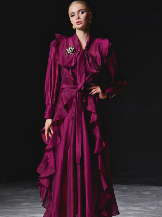 Embrace romantic elegance with the Ndoki Long Sleeve Ruffle Maxi Dress. This enchanting gown features delicate ruffles that add dimension and whimsy, while long sleeves provide graceful coverage and timeless appeal. The flowing maxi silhouette creates a dreamy, ethereal look perfect for formal events, weddings, or special occasions where you want to feel absolutely magical. The ruffle detailing catches movement beautifully, ensuring you turn heads as you move through any room. Whether you're celebrating a milestone or simply want to feel extraordinary, this dress delivers the perfect blend of femininity and sophistication. Invest in a piece that makes you feel like the best version of yourself—a timeless treasure that radiates grace and charm.